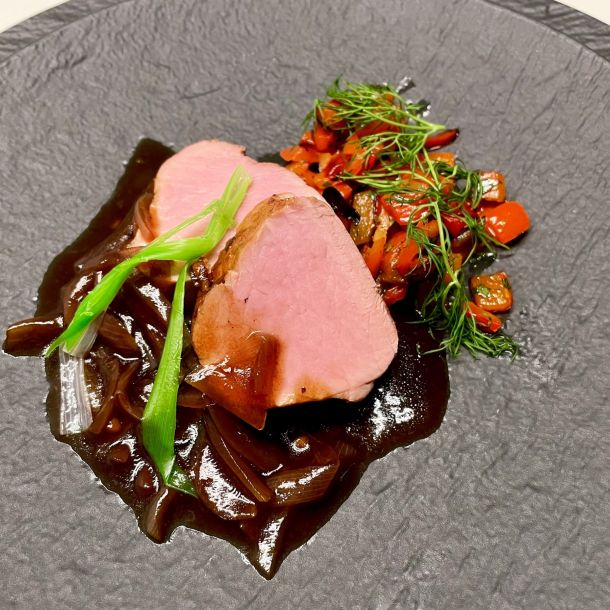 Ein mit Aromen von Champagner gestopftes Risotto mit feinen Black-Tiger-Garnelen.